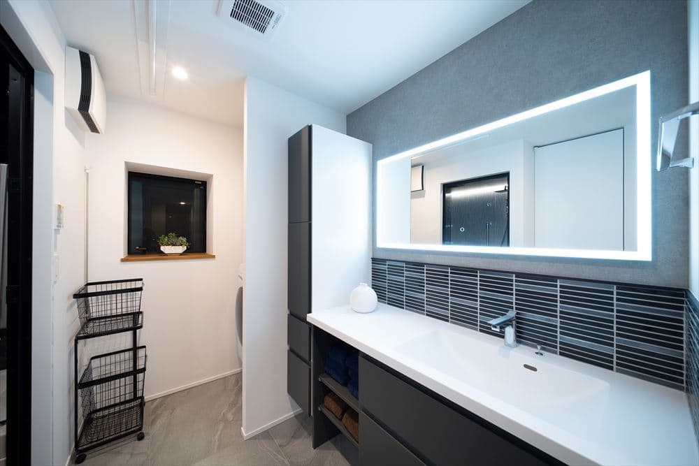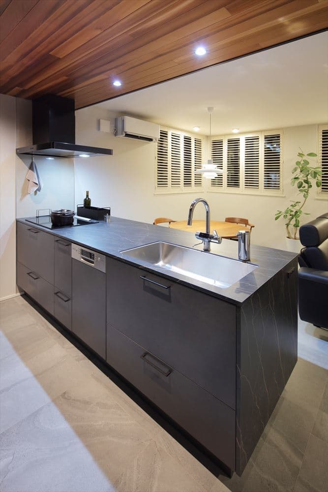 KOBEKITCHINのセミオーダーキッチンやアイカのオーダー洗面台、ウッドシャッターや外観のルーバー格子など、施主のこだわりを実現したオーダーメイドの対応がいたるところにされています。