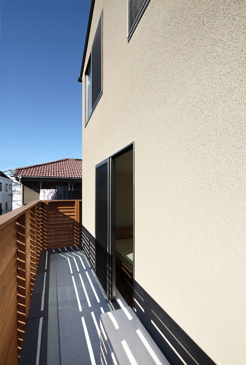 バルコニー部分の木材の外壁が特徴的な、住宅密集地の中でも存在感のある外観デザインでもあります
