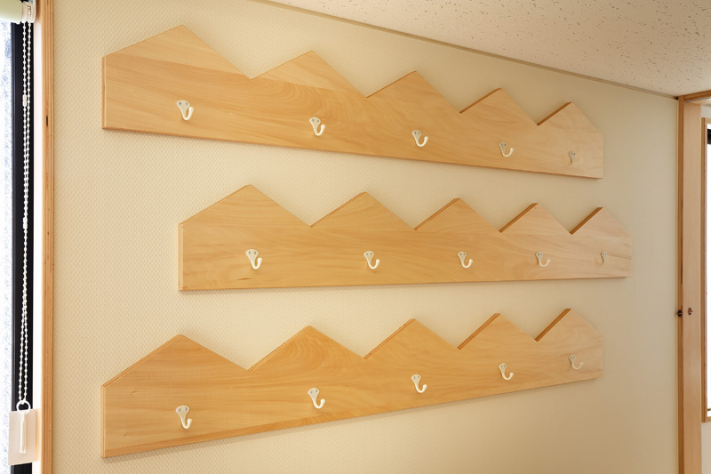 柔らかい素材のクッションフロアを使ったり、柱を人工芝で巻いたり、布団を入れる収納には穴をあけて通気性を良くしたりと、幼い子供たちのこと考えた提案がところどころにあります。