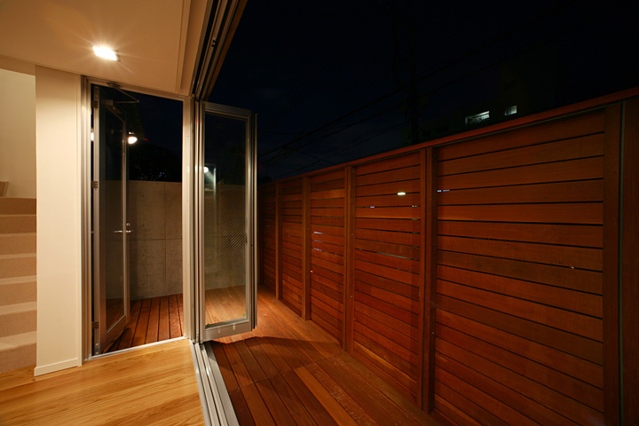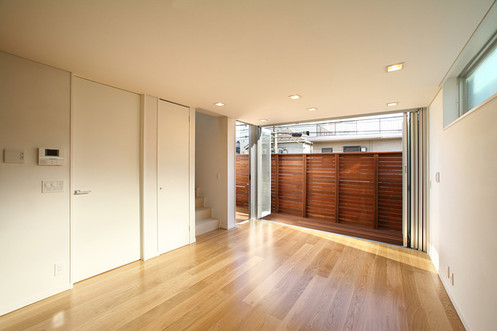 斜線制限が厳しい立地条件だったが、トップライトを天井に配置することで高さをクリア。交通量の多い道に面しているため、家の中ではプライベートな時間を楽しんでいただけるよう、バルコニーの高さを調節してプライバシーを確保した。