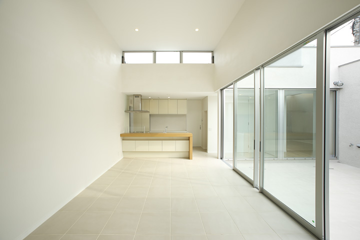 バス通りに面した高級住宅街に建つ、夫婦二人の為の贅沢な住まい。平屋建ての中庭を中心にプラン。中庭とリビングや各室が一体となり、一つの空間として、内と外を曖昧にしている。リビングの天井高は4mで開放的な空間を実現。ハイサイドの窓を開けると爽やかな風が抜けていく。プライバシーを確保しながらも、朝から夕方まで電気を使う必要がないほど明るく風通しが良い。