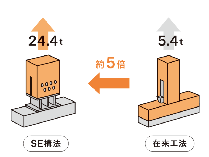 基礎と柱が柱脚金物で直接つながることで、土台を介する在来工法と比較して、地震時の柱引き抜き強度が高い。