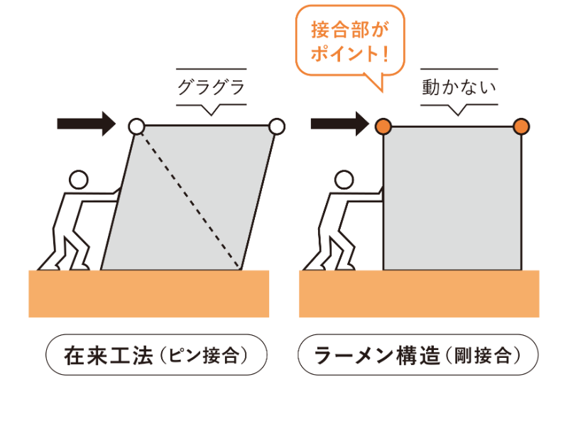 柱と梁の接合部の強度があるので、フレームだけで耐震性を発揮できる。在来工法の場合は筋交いなどの耐力壁が必要となる
