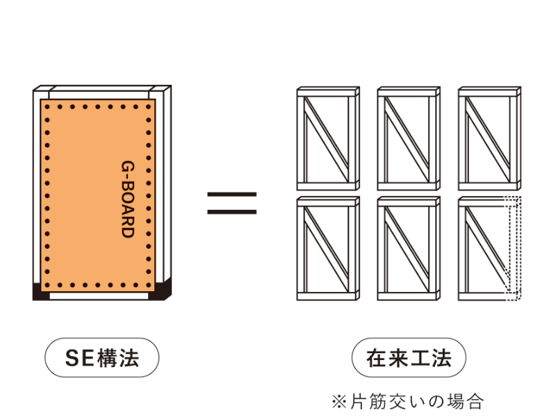 Gボードと特殊釘による耐力壁は、在来工法で使用する方筋交いと比較して5.8倍の強度を発揮する。