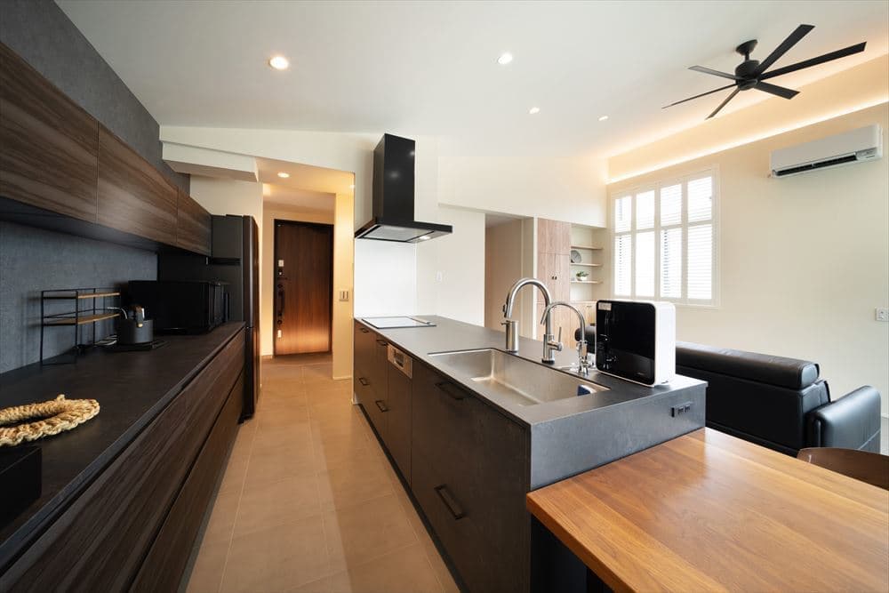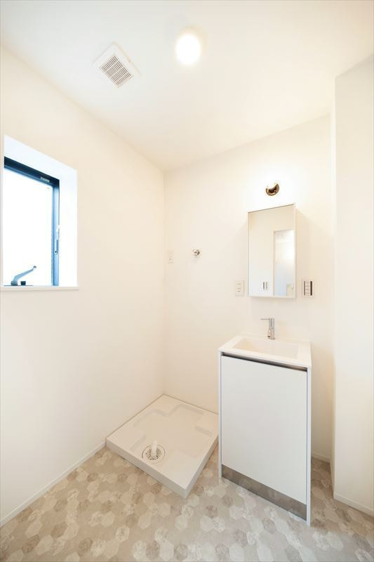KOBEKITCHINのセミオーダーキッチンやアイカのオーダー洗面台、ウッドシャッターや外観のルーバー格子など、施主のこだわりを実現したオーダーメイドの対応がいたるところにされています。
