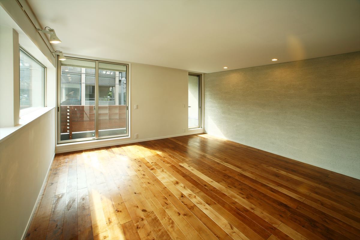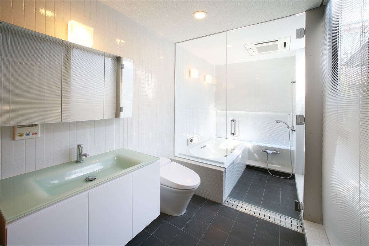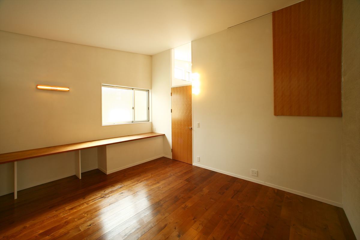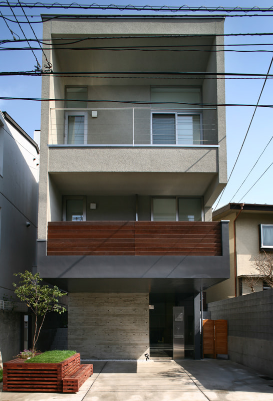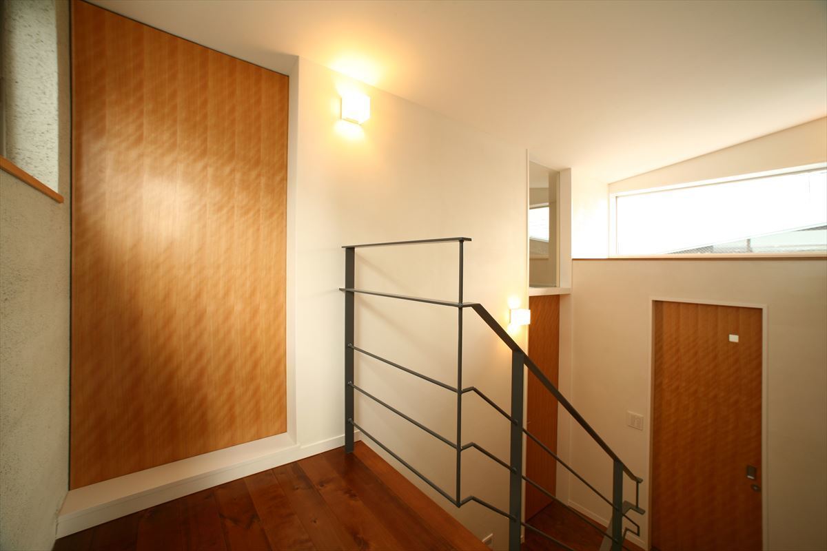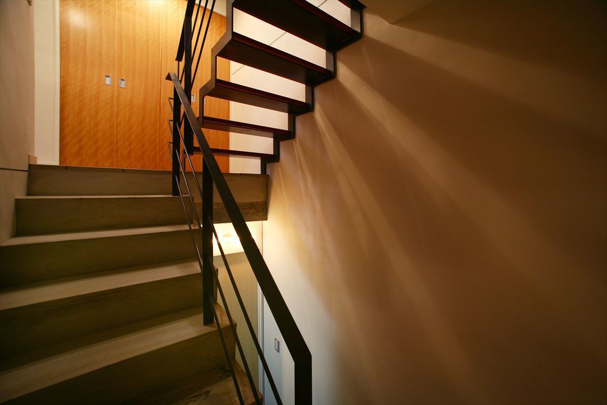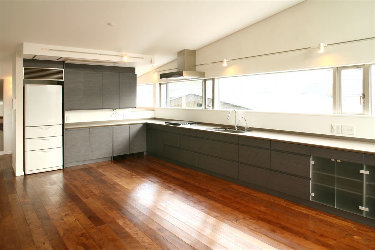 スキップフロアを採用することにより地下事務所の打合せスペースは天井を高く自然採光を可能にし、上階の居住スペースは各室の空間が繋がるようにプラン。目線で横長に連続するダイナミックな窓が部屋と空を近づける。環境に優しい家庭用燃料電池エネファームを設置。