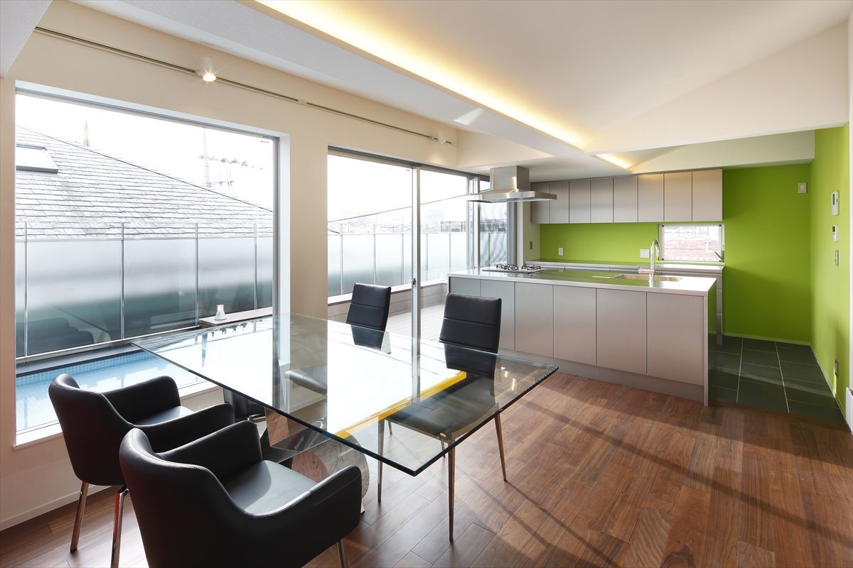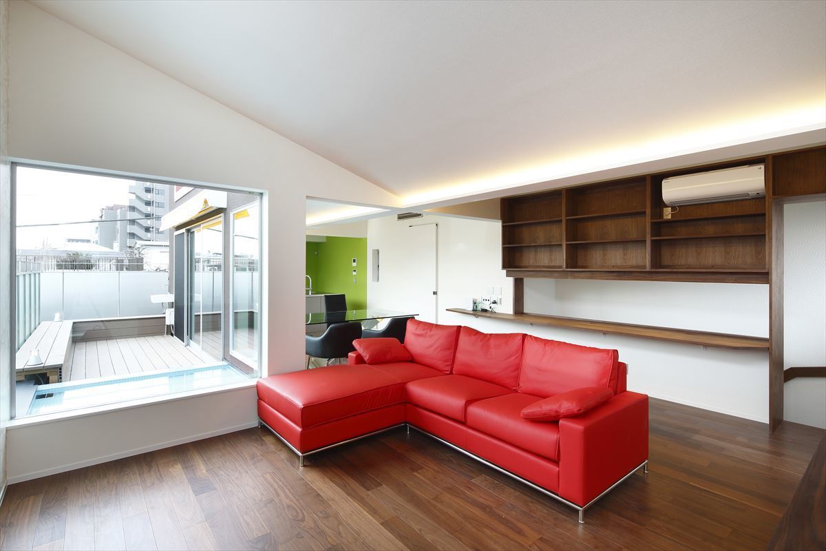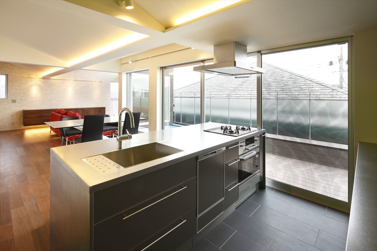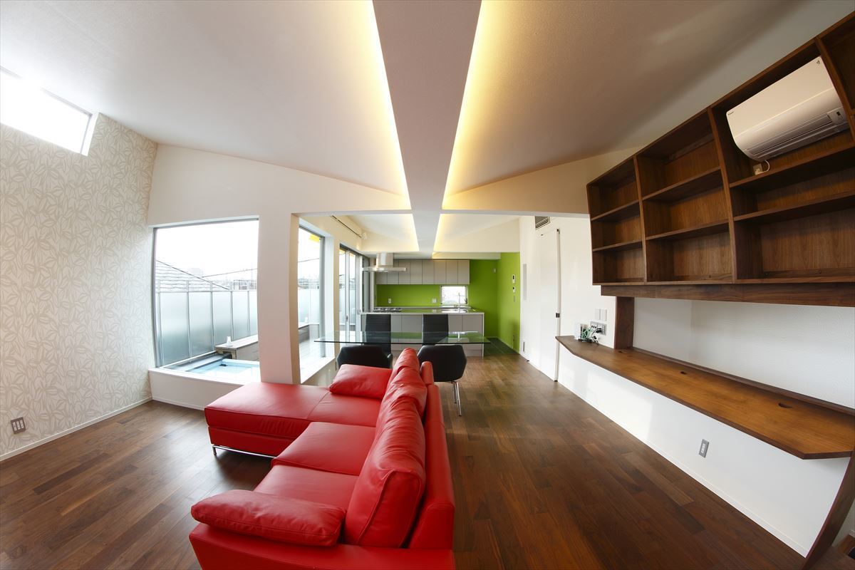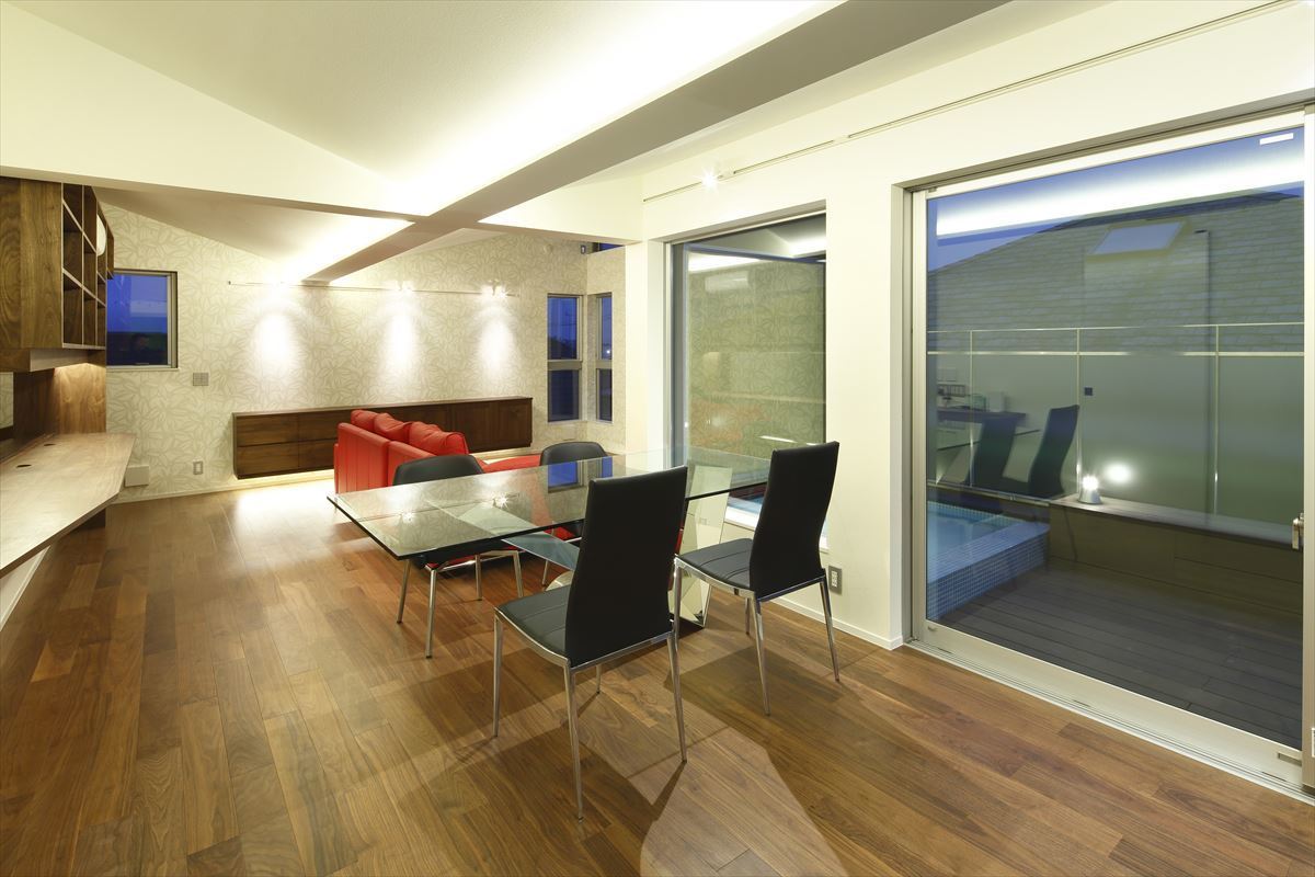 SE構法の構造の強さを活かして2台分のビルトインガレージを設けています。3Fリビングダイニングでは各方位高さに抜けのある開口を設け、様々な角度から空が見えるとても解放感のある空間を目指した住宅です。特に夕方には窓からの夕焼けがとても綺麗に見えます。