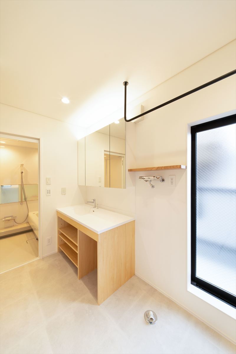隣地で事業を営まれているご家族のための、2世帯住宅。敷地と道路の間に高低差があったため、その段差を利用して、1階を半分埋める形で、3階建てのボリュームを得ている。南側、東側が、背の高い建物に囲われているため、階段室の吹き抜けを利用して、下階に採光を導く構成にするなど、断面方向の繋がりを考慮して計画している。