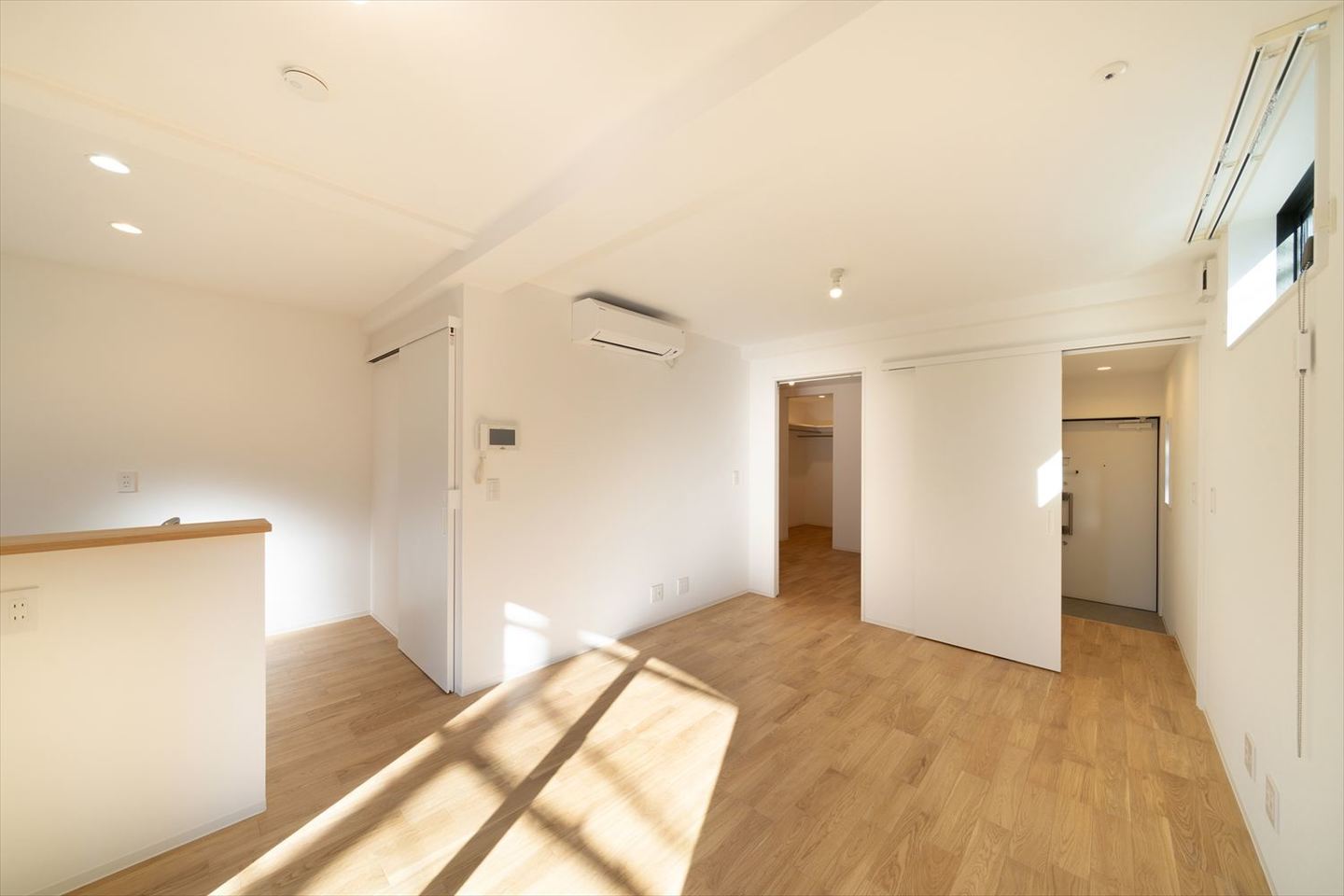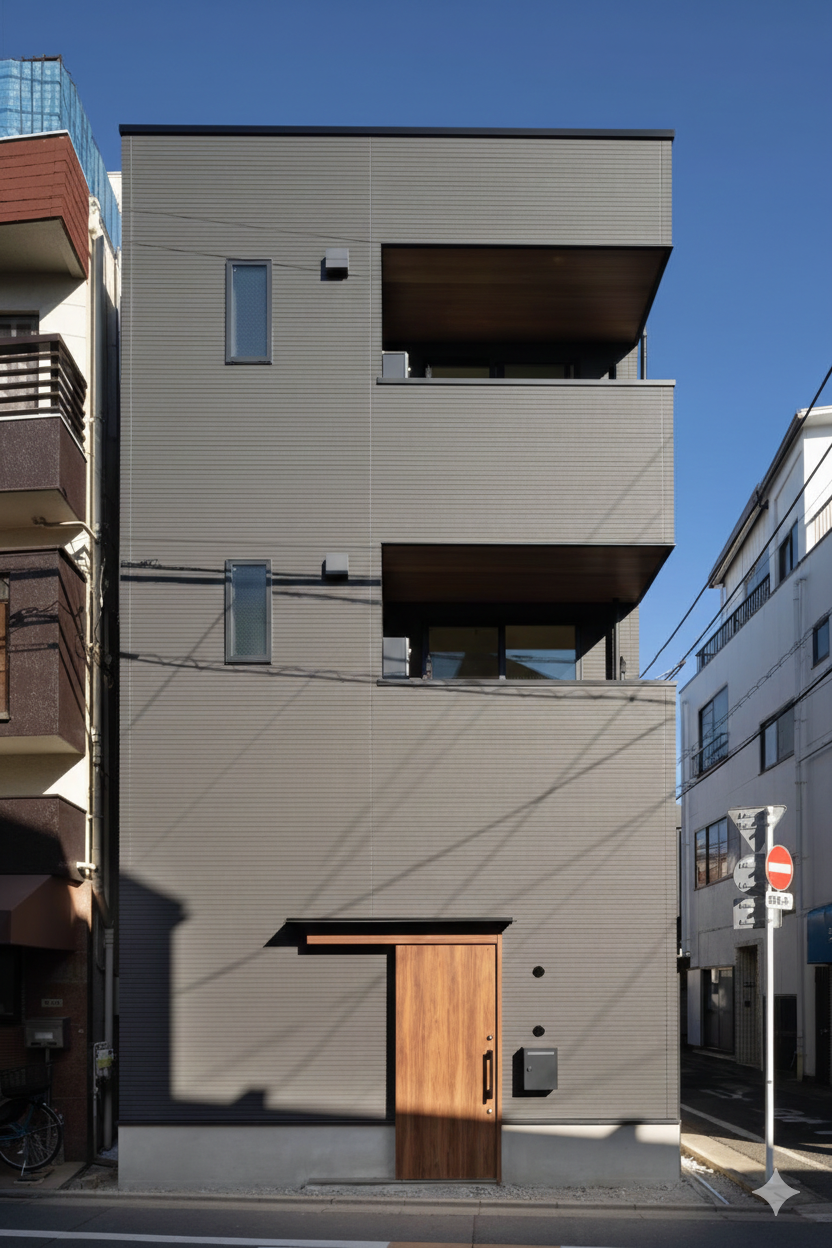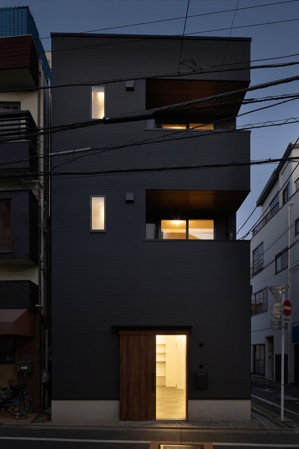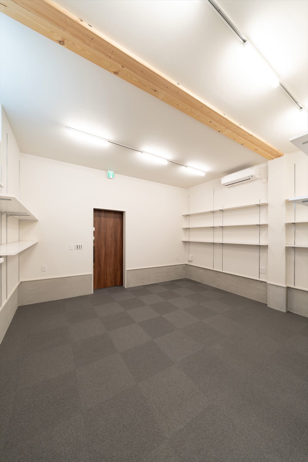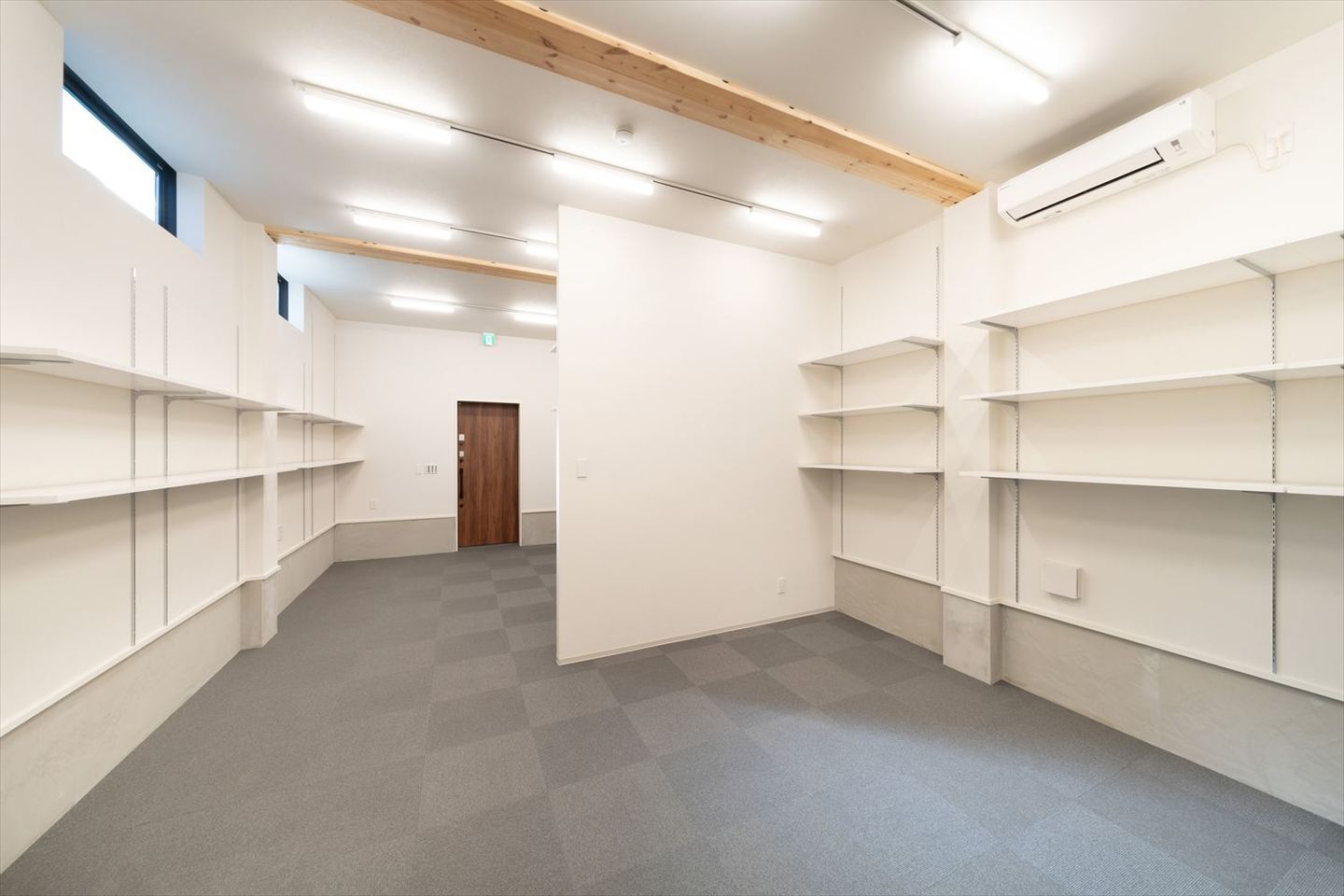 1階を事務所、2・3階を共同住宅とした職住併用の計画です。 1階の事務所スペースは、SE構法の強靭なフレームを活かすことで、室内に柱や壁のない開放的な大空間を実現しました。高い天井と自由度の高いレイアウトを確保し、壁一面に商品在庫を効率よく収納しながら、広々とした作業・事務スペースを両立させています。 居住階となる2・3階は、建物が密集する商店街という立地を考慮し、窓の配置や採光計画を工夫することで、街並みの中にありながらも外の光が心地よく差し込む明るい住空間を創り出しました。
