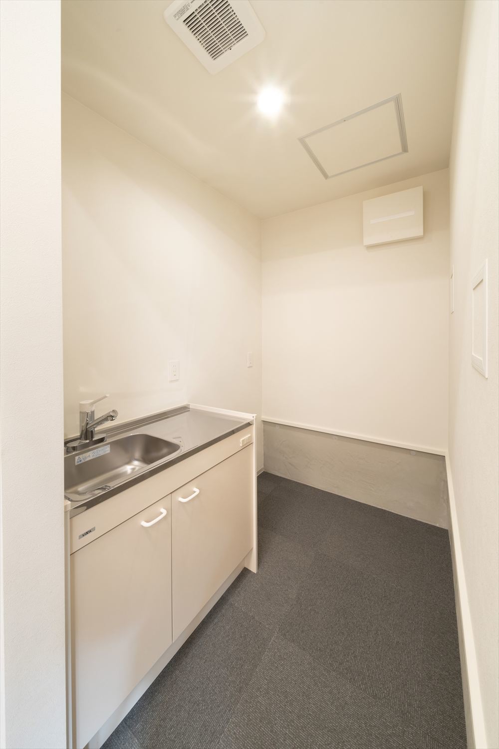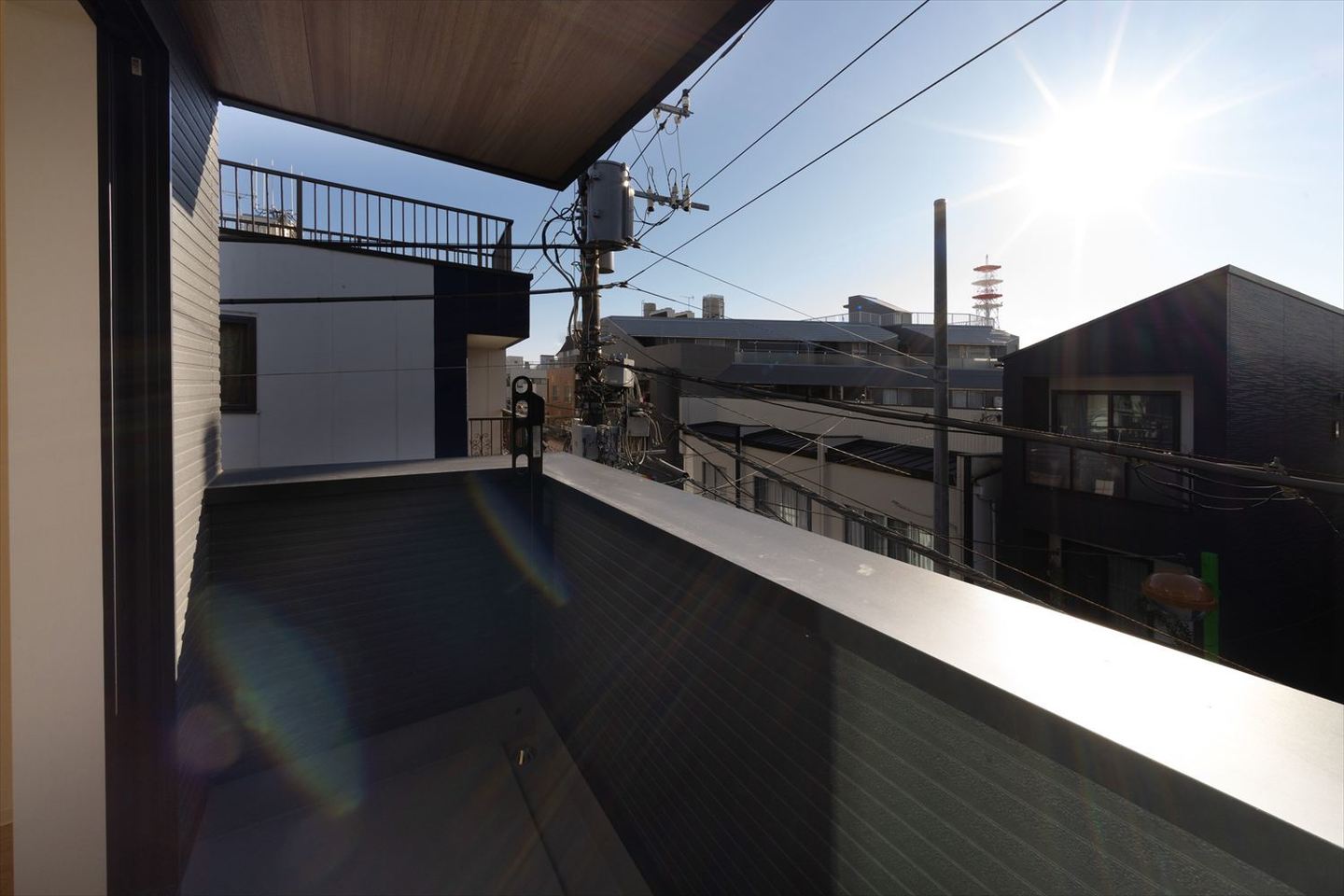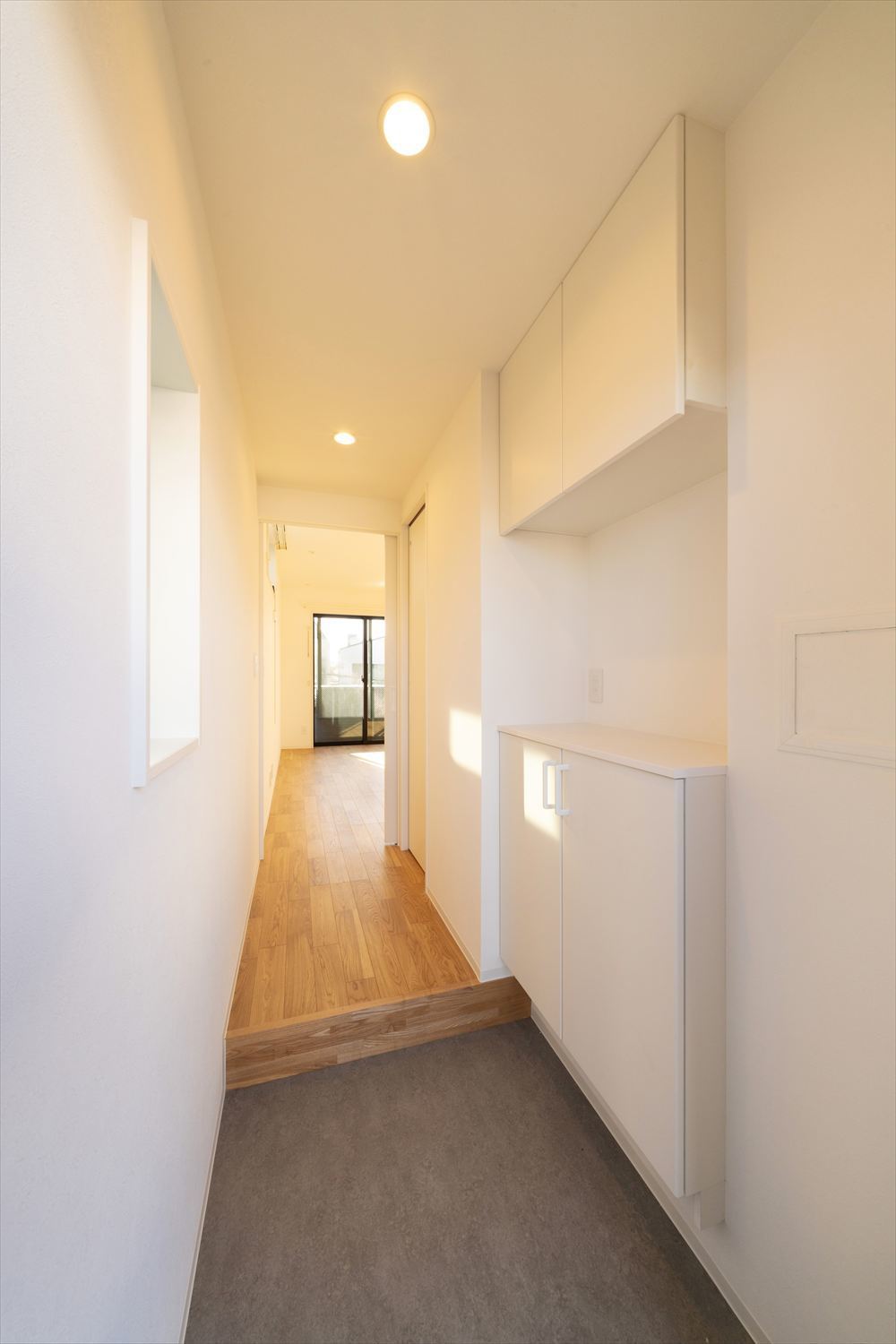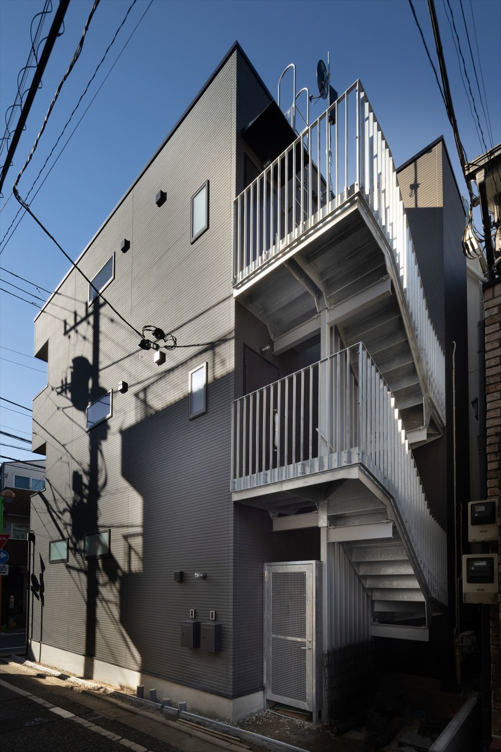 1階を事務所、2・3階を共同住宅とした職住併用の計画です。 1階の事務所スペースは、SE構法の強靭なフレームを活かすことで、室内に柱や壁のない開放的な大空間を実現しました。高い天井と自由度の高いレイアウトを確保し、壁一面に商品在庫を効率よく収納しながら、広々とした作業・事務スペースを両立させています。 居住階となる2・3階は、建物が密集する商店街という立地を考慮し、窓の配置や採光計画を工夫することで、街並みの中にありながらも外の光が心地よく差し込む明るい住空間を創り出しました。