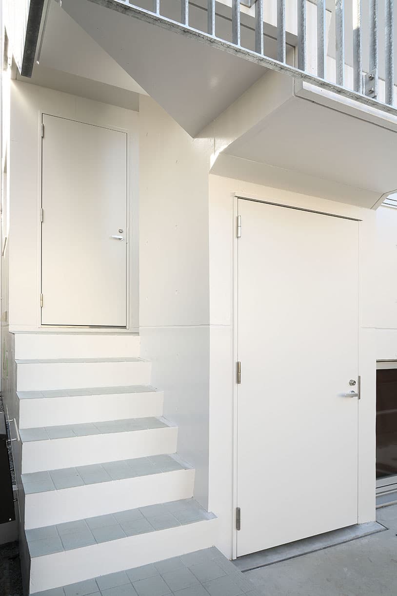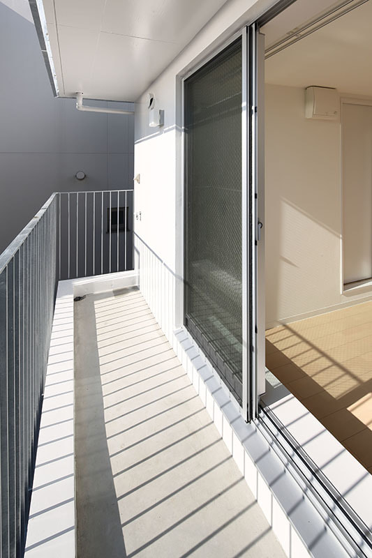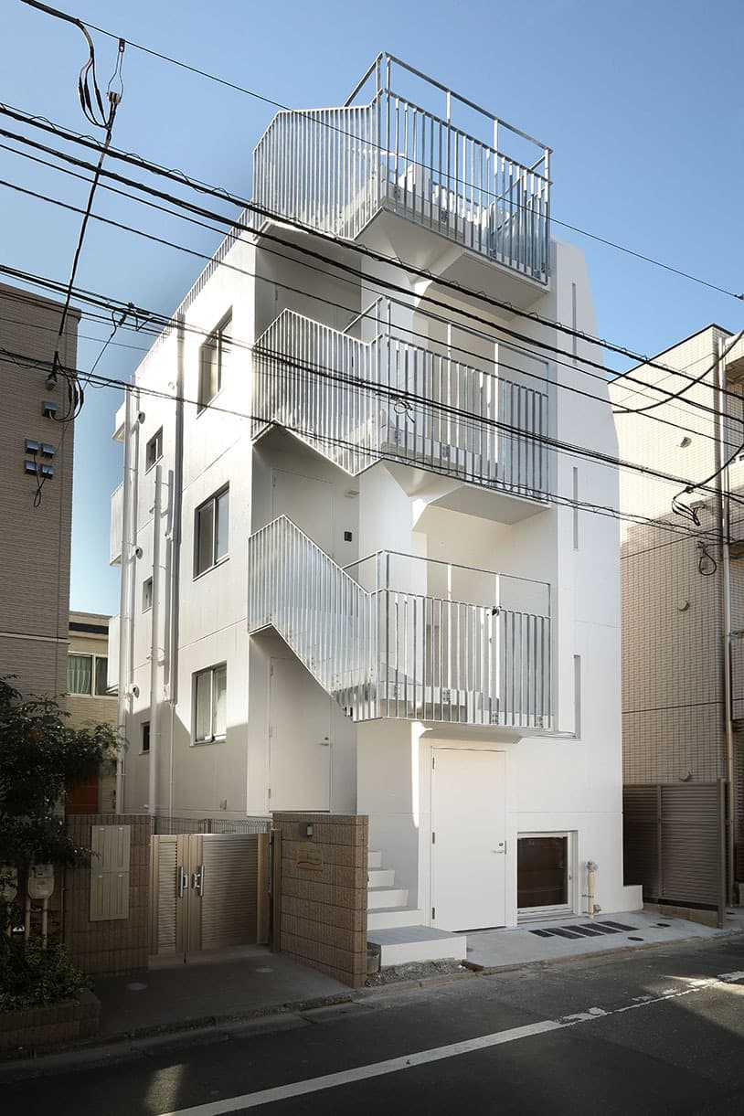 外観デザインはRC打ち放しに白い塗装の外壁をベースとして、外階段の亜鉛メッキの手摺がシンプルさに一つのアクセントを加えています。