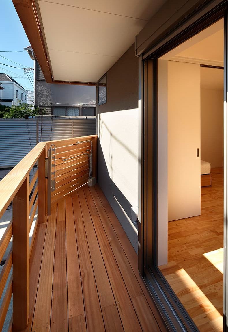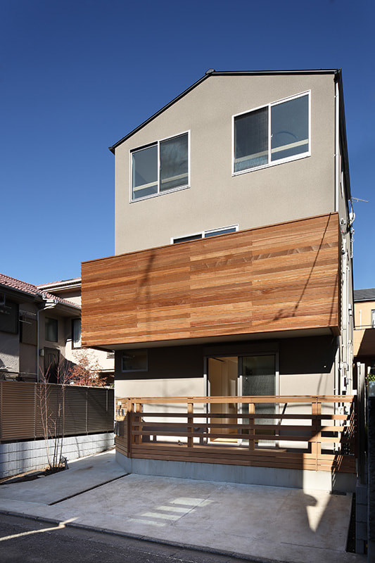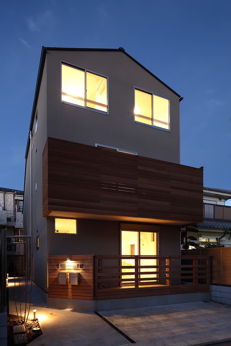 バルコニー部分の木材の外壁が特徴的な、住宅密集地の中でも存在感のある外観デザインでもあります