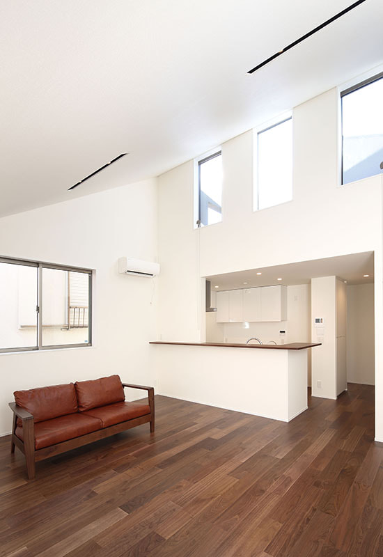 あえてリビングを敷地の北側に配置することで、斜線制限を利用した大きな吹抜けの空間を実現させ、そこに3階のルーフテラスから光や風を通すことで、家の中にいても空を感じる住宅になりました。